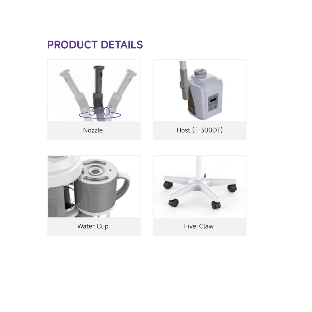 This device integrates multiple functions, including ozone sterilization, hot spraying, water level detection, fragrance/herbal therapy, and adjustable spray volume, catering to different skincare needs. It features an adjustable nozzle, a convenient water cup design, and a sturdy five-claw base for stability and safety during use. The main unit (F-300DT) is equipped with a digital display for intuitive and precise operation, adding a technological touch to skincare treatments.